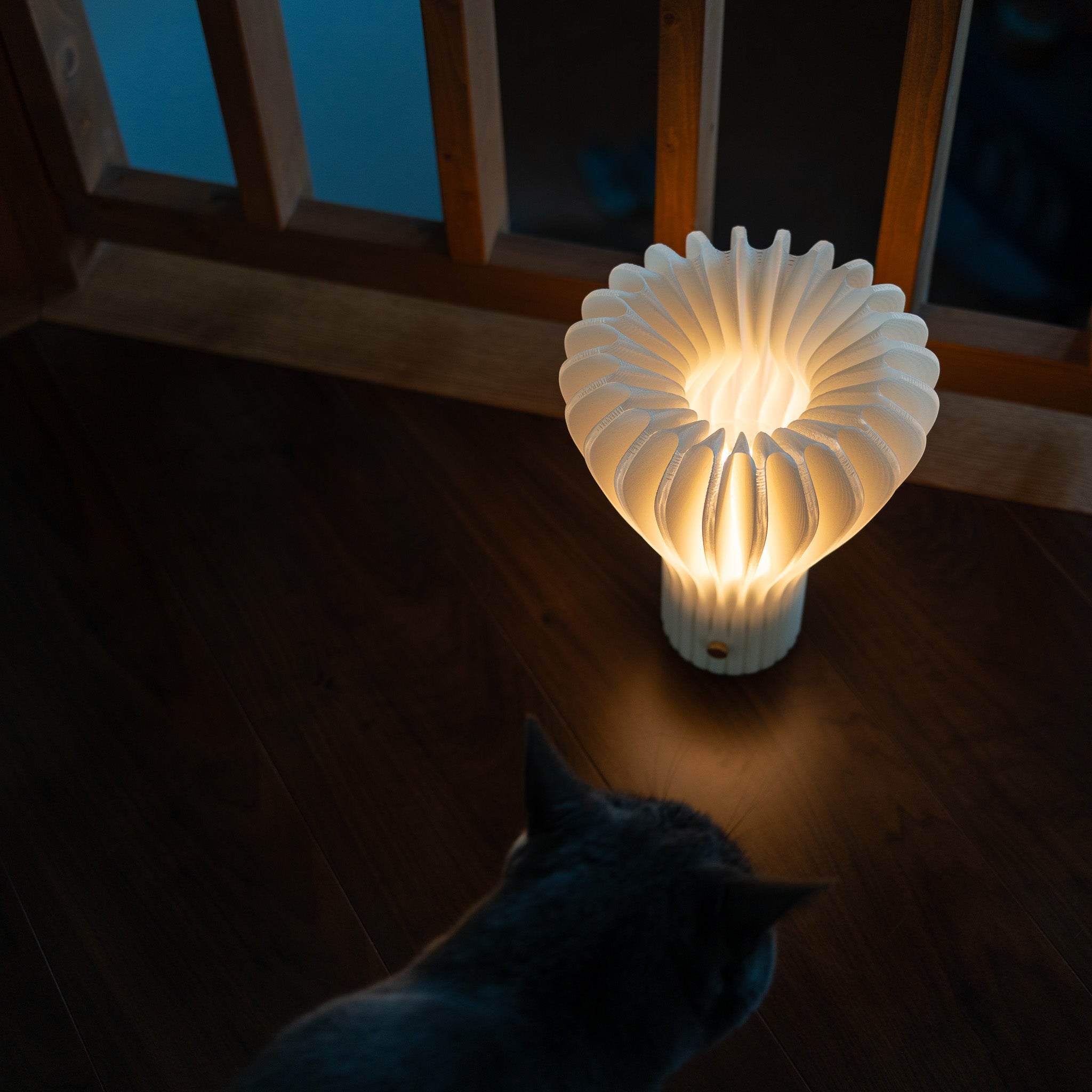 このランプ は、高電圧を使わないUSB-C給電で動作します。ノートPCやスマートフォンでも一般化している方式なので、特別な周辺機器を用意せず、日常の延長で扱うことができます。内部(ベース部分)には、燃えにくく高温に強い素材(難燃性PLA/ABS)を採用しています。暮らしのそばに置く道具として、万が一のときにも安心な材料を選んでいます。