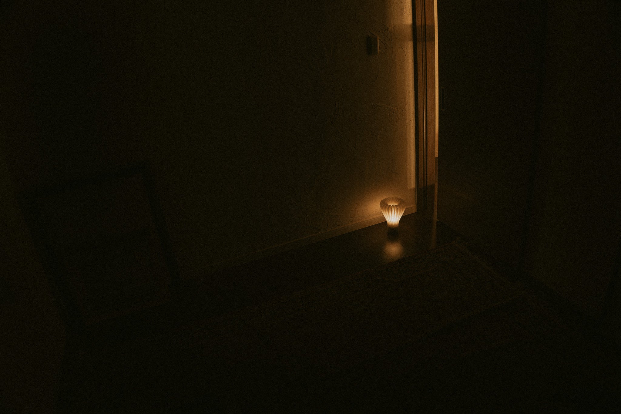 このランプの光は、部屋を明るくするためではなく、暗闇とともにあるための灯りです。月明かりや雪あかりのようにやわらかく、文庫本が読めるほどの明るさまで調整できます。タッチ式ではなく手で回すノブで、指先が覚える“ちょうどいい光”を探せます。